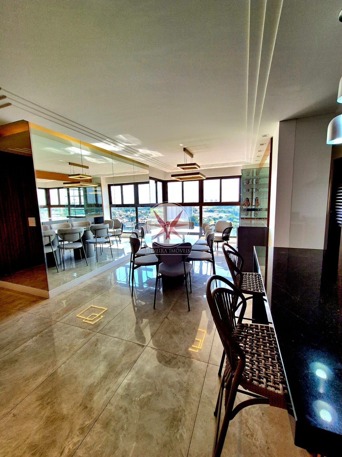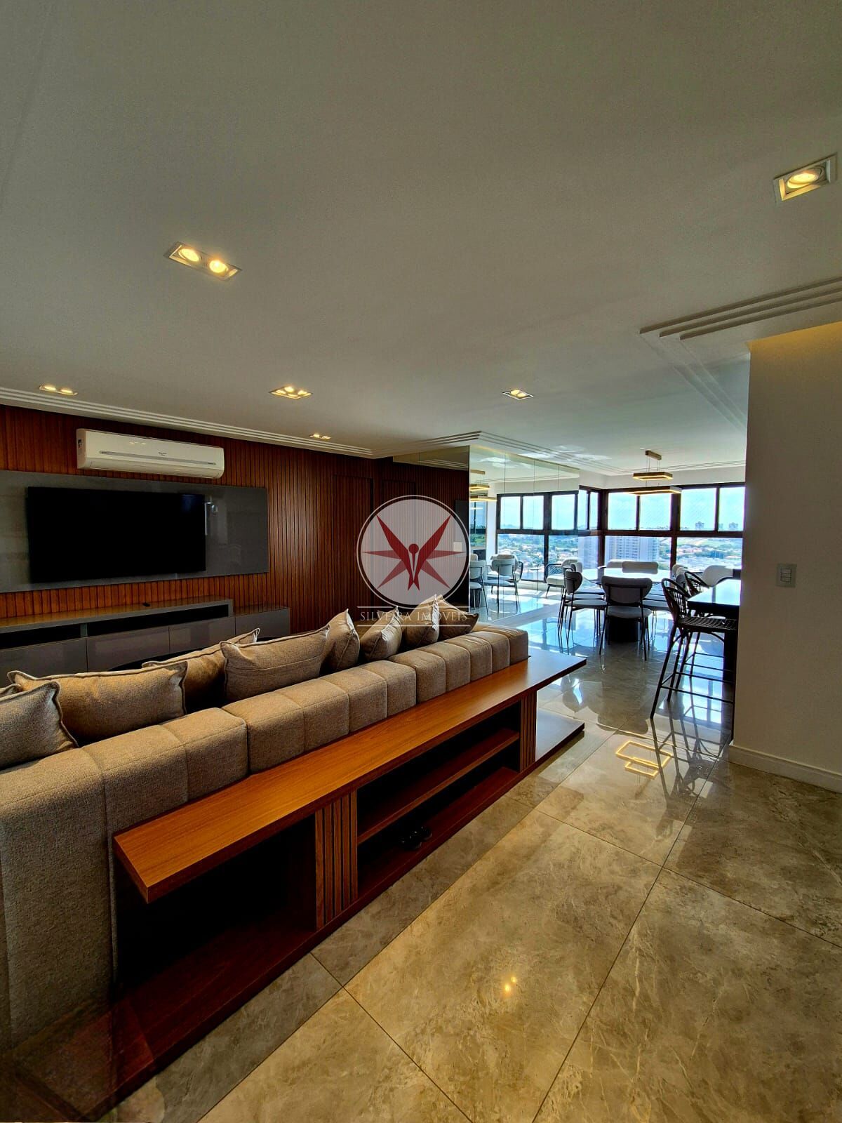 A planta bem distribuída oferece sala de jantar integrada à sala de TV, lavabo, cozinha planejada e área de serviço completa. Todos os ambientes são climatizados e contam com marcenaria sob medida de alto padrão.