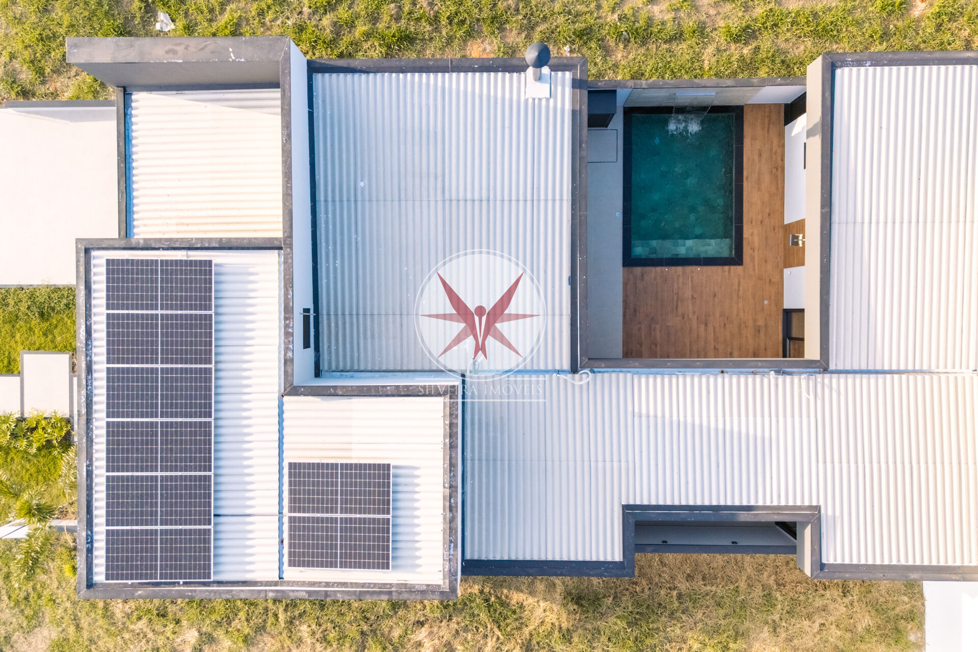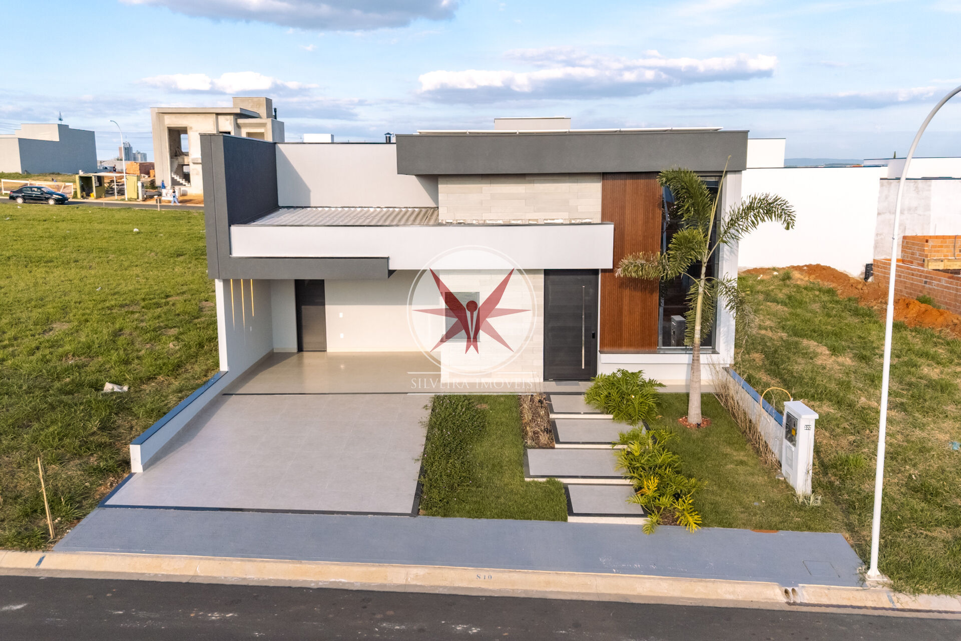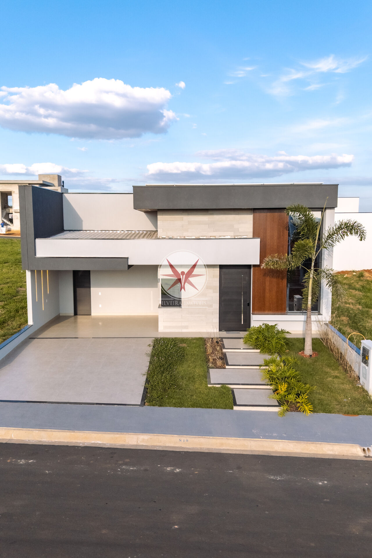 -Revestimento cimenticio ( imitando concreto ), ripado em alumínio, pele de vidro na janela da sala, teto do beiral imitando madeira.