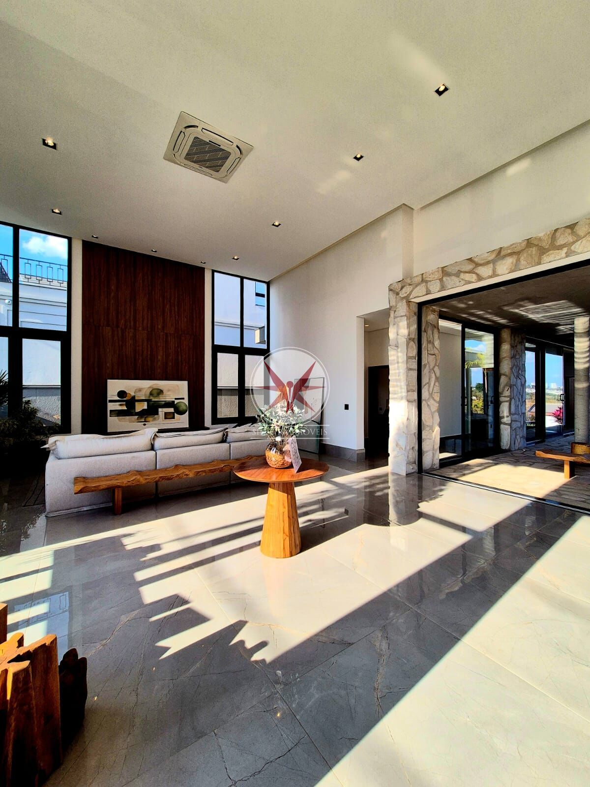 - Salão de festas equipado com mesas, cadeiras, ar condicionado, churrasqueira, forno de pizza e fogão a lenha.